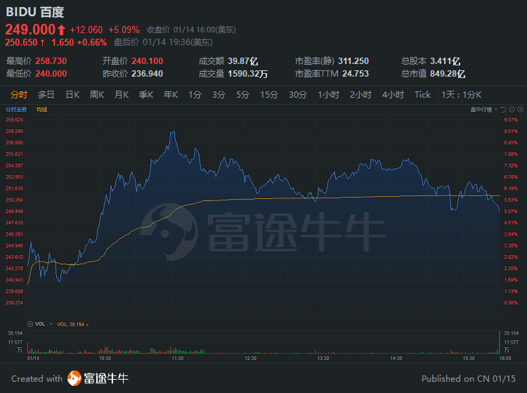 周四,百度收涨5.09%,报249美元/股,最新市值849亿美元。今年以来,百度股价累涨15%。