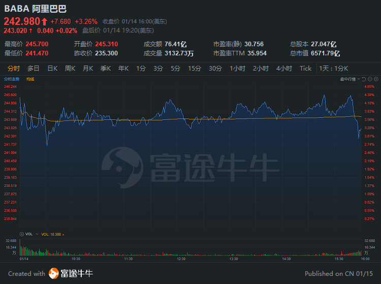 周四,阿里巴巴收涨3.26%,报242.98美元/股。昨日,瑞信发布研究报告称,维持其「优于大市」评级,目标价334美元。
