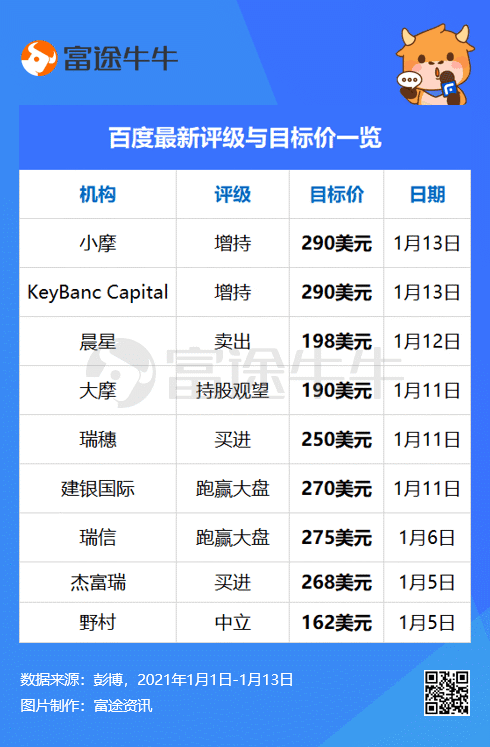 彭博显示,小摩分析师Alex Yao和KeyBanc Capital分析师Hans Chung同时在1月13日将百度目标价更新为290美元,评级均为「增持」。此前小摩给予百度的目标价为150美元,此次上调幅度超93%。
