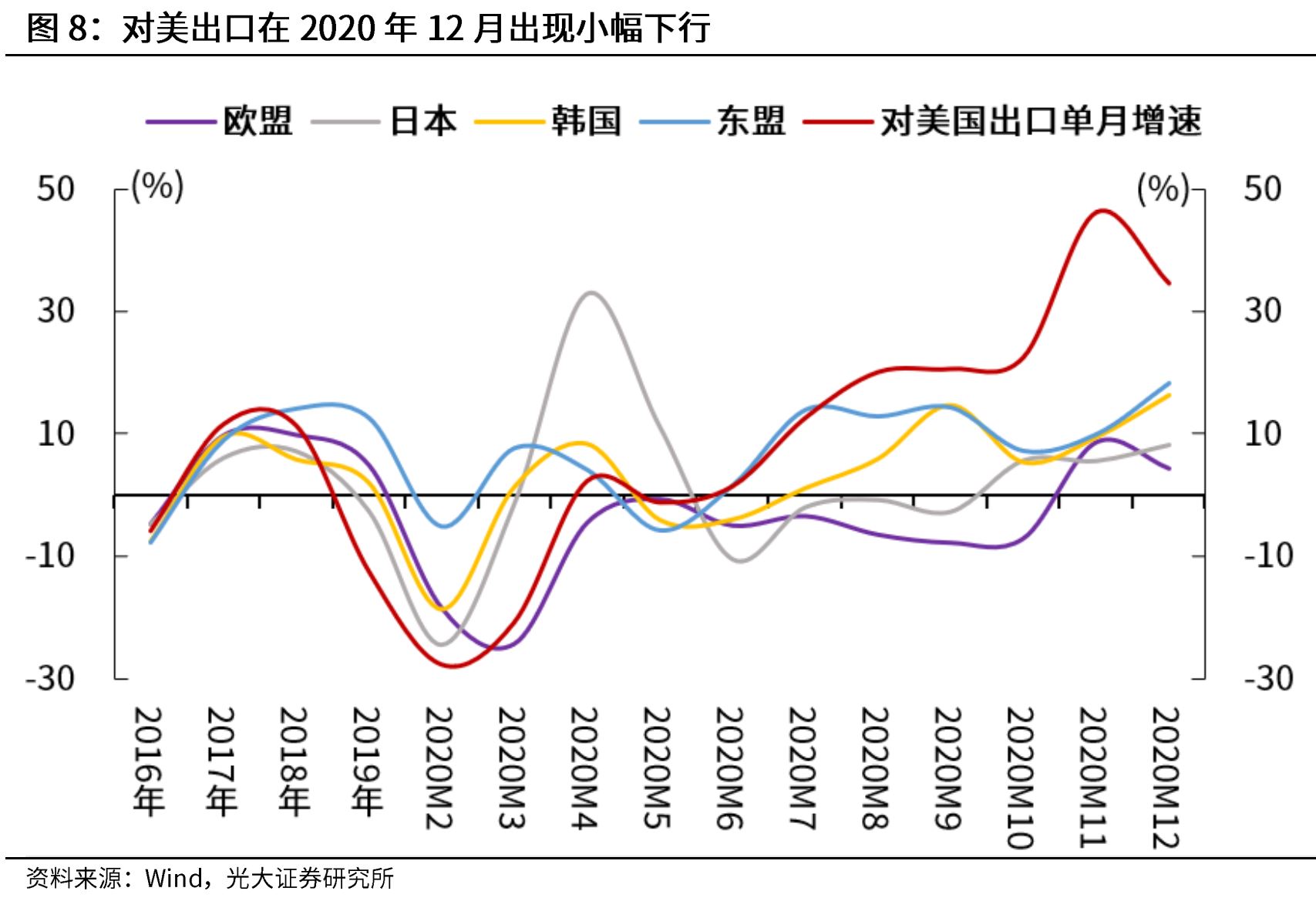 我们认为,虽然出口2020年12月同比回落,但是属于“圣诞消费季”的正常扰动。从防疫物资和非防疫物资两条线来看,全球市场对于中国产品的需求仍然较强。尤其是美国对中国产品的需求仍将持续: