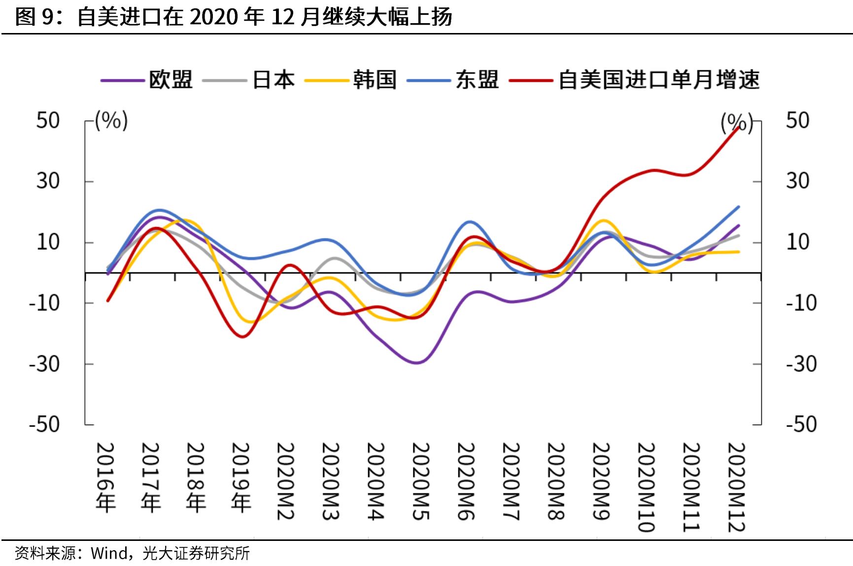 进口增速进一步回升,自美进口大幅回升。2020年12月,我国进口增速从11月的4.5%回升至6.5%,上行幅度略超过市场预期。其中,自美进口出现大幅回升,单月增速上行了15个百分点至47.7%,美国经济复苏受疫情约束,海外各国自顾不暇,2020年11月,美国向其余国家(除中国)单月出口增速仅为-15.2%,远低于向中国出口。