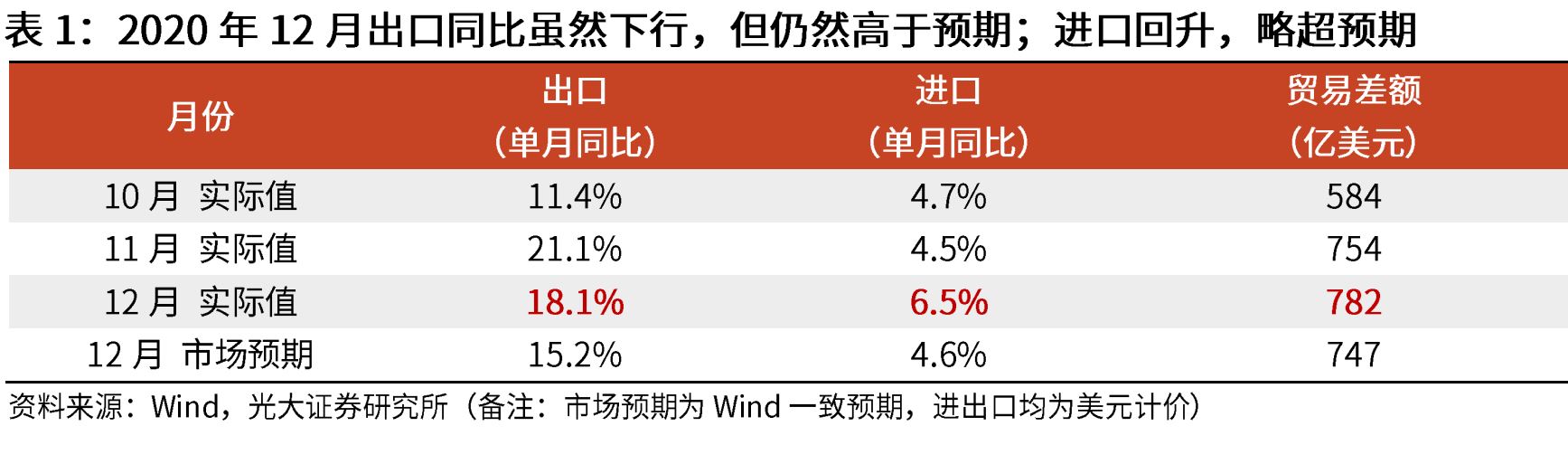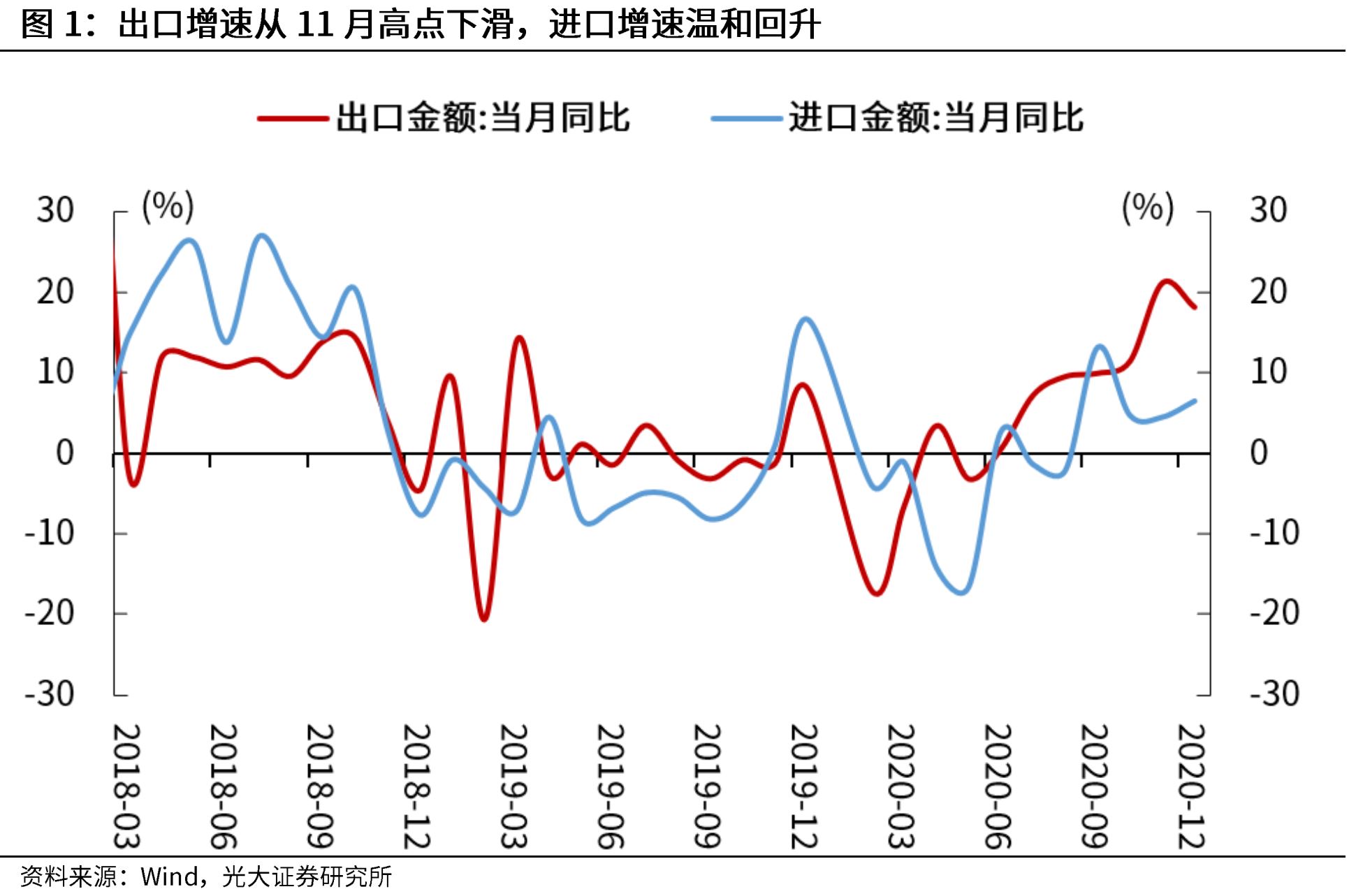 事件:2021年1月14日,海关总署公布2020年12月贸易数据,12月出口(美元计)同比18.2%,前值21.1%,市场预期为15.2%;进口(美元计)同比6.5 %,前值4.5%,市场预期为4.6%。