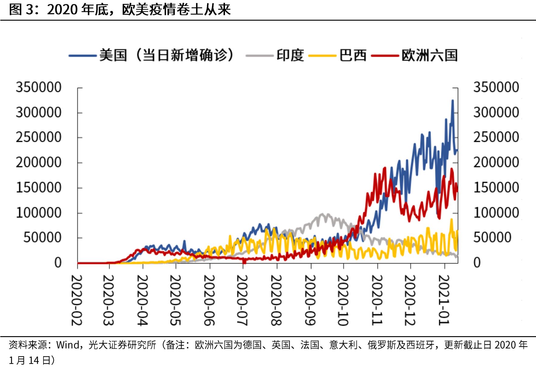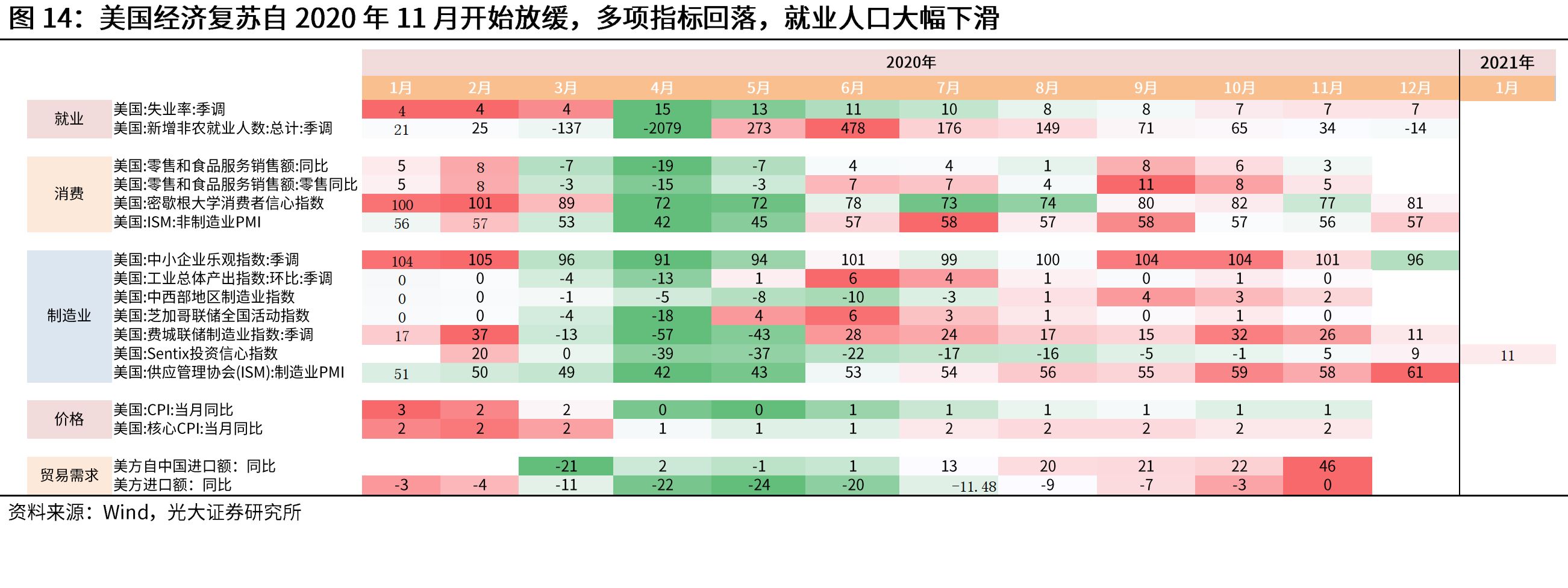 美国2020年12月非农就业人口减少14万人,预期增6.2万人,这也是自2020年4月份以来的首次转负;2021年1月2日当周初申失业金人数78.7万人,居高不下。美国疫情不断肆虐,对经济的影响日益严重,在新冠疫苗接种节奏低于预期的背景下,美国供应链的恢复可能尚需时日。