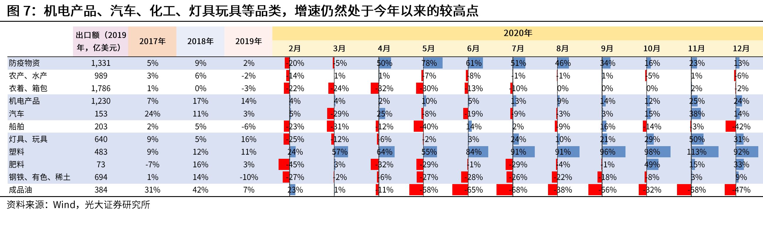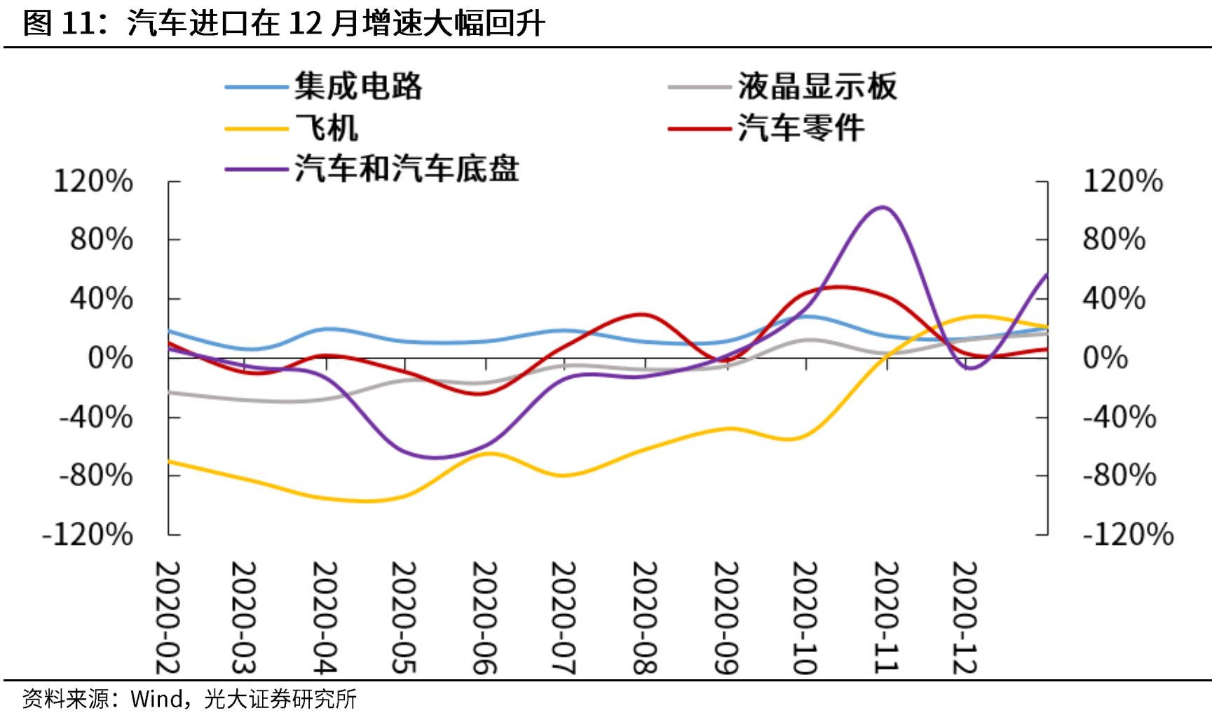 非防疫物资:“宅经济”和机电产品、汽车出口增速仍然处于相对高位。2020年11月的出口高点,会显得12月出口数据相对黯淡,但是,从细分品类来看,12月 “宅经济”品类(灯具、玩具)和机电(显示屏、集成电路)、汽车产业链增速仍然处于相对高位,工业品出口增速则进一步上行。作为对比,旅游出行相关消费(箱包、衣物、船舶)受到疫情限制,出口增速出现下滑。