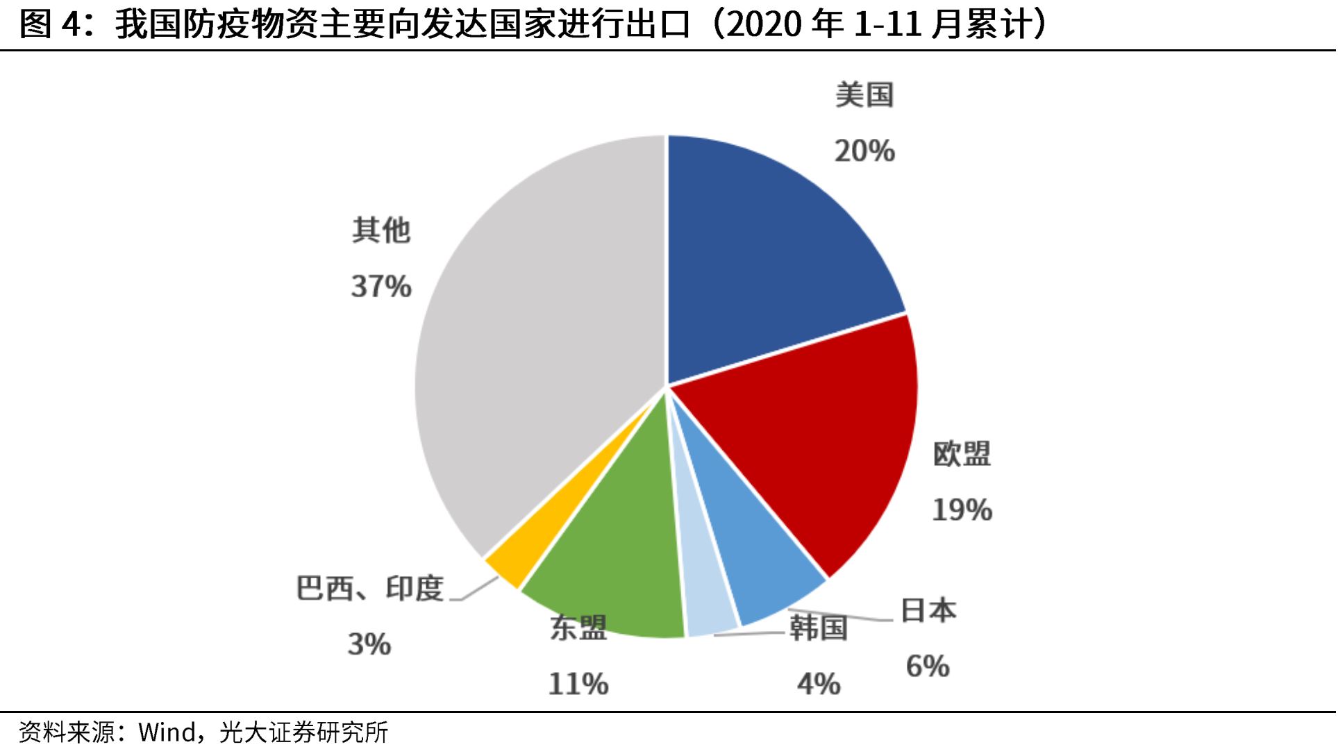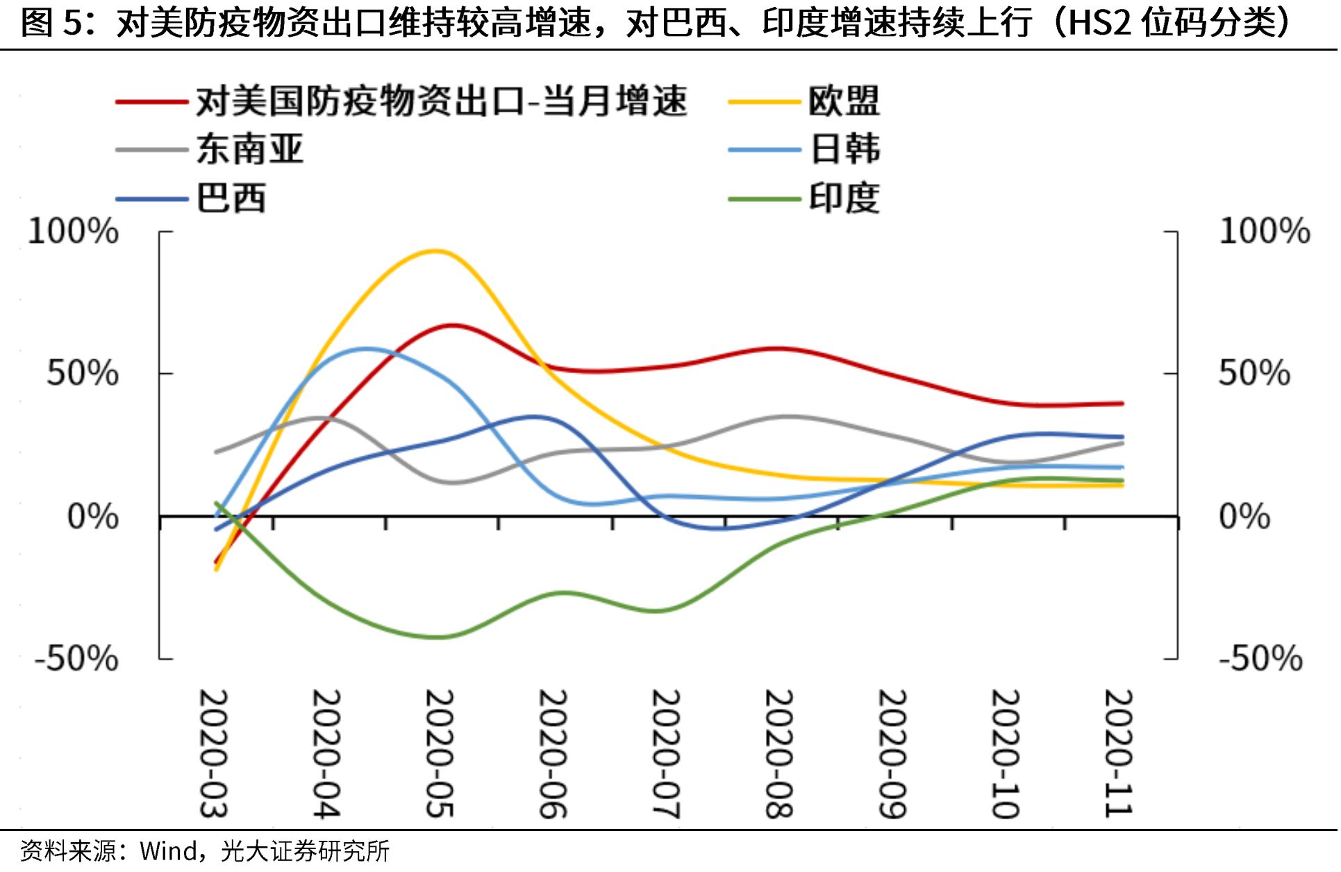 按照HS-2位码[1]对出口进行拆分,2020年1-11月,防疫物资约占中国出口的15%,高于2018年及2019年的12%。中国防疫物资主要向欧美出口,共计占比 39%;向东南亚、日韩出口占比约为21%,向印度、巴西出口约为3%。到2020年11月为止,防疫物资对美国出口仍然维持较高增速,对印度、巴西出口持续上行,这与近期各国的疫情走势也是基本吻合的。