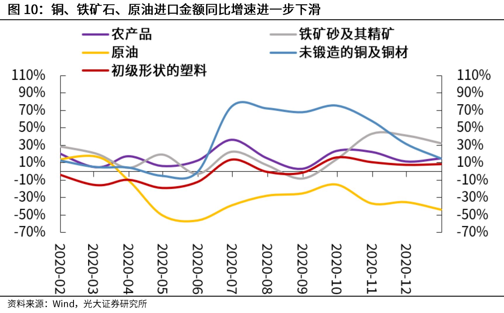 主要进口商品来看,铜、铁矿石、原油进口金额同比增速进一步下滑,但是汽车进口金额同比增速从11月以来大幅提升。