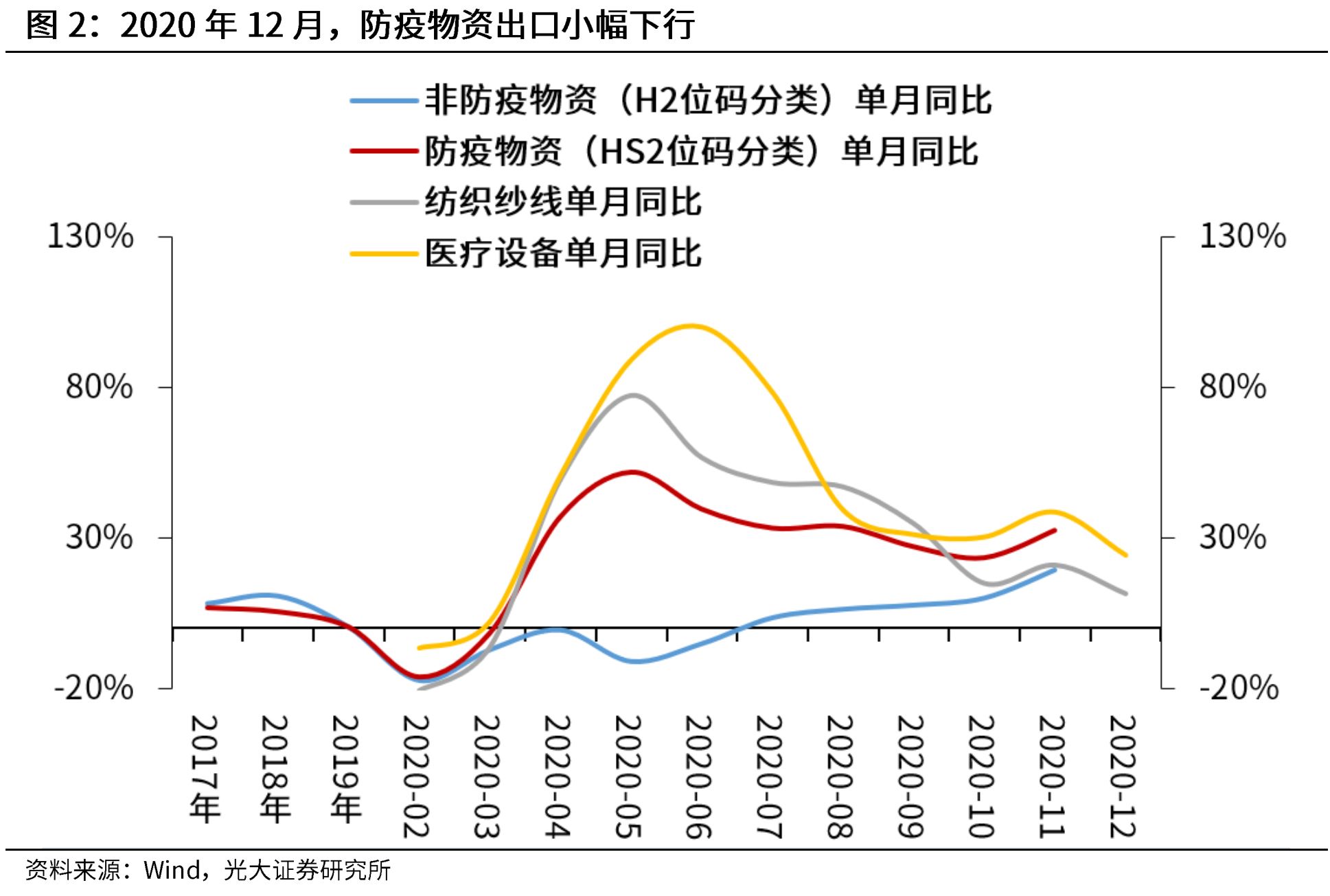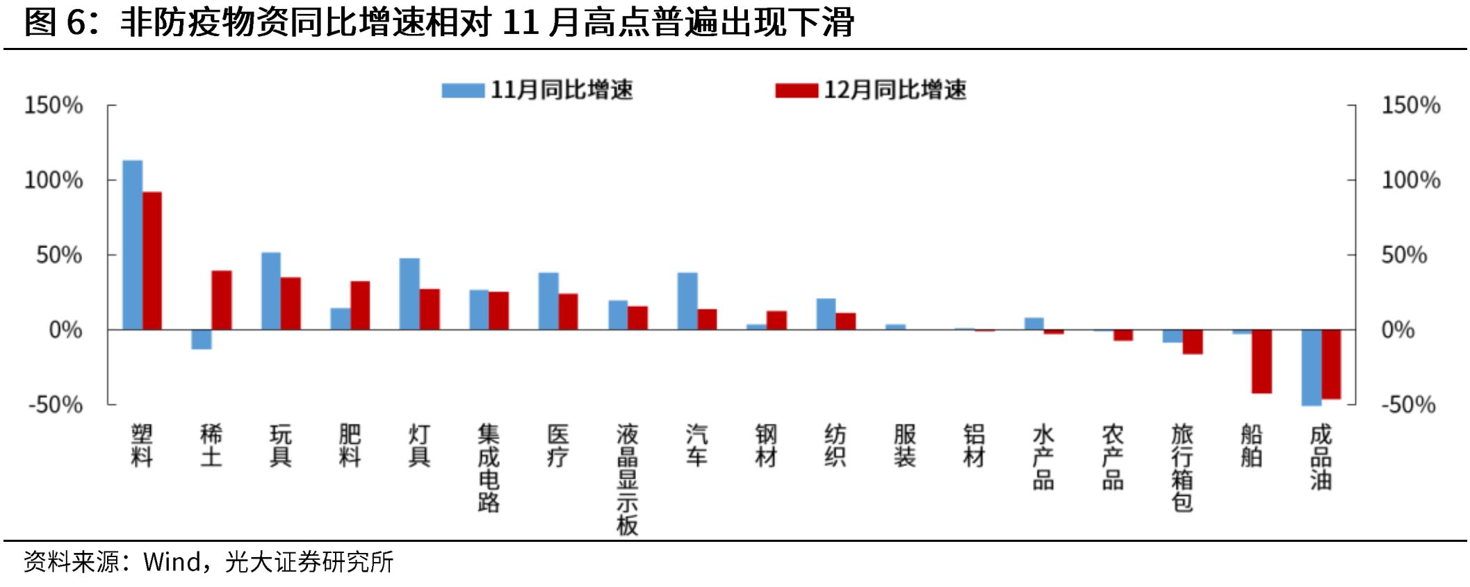 防疫物资出口下行,或因产能优先供应国内。防疫物资出口增速在11月止跌回升后,在12月再次回落,纺织纱线增速回落10个百分点至11%,医疗器械回落14个百分点至24%。我们认为,一方面,10月底海外疫情开始抬头,防疫物资或许集中在11月份放量采购;另一方面,近期国内疫情多点复发,防疫物资需求提升,产能或优先满足国内需求。