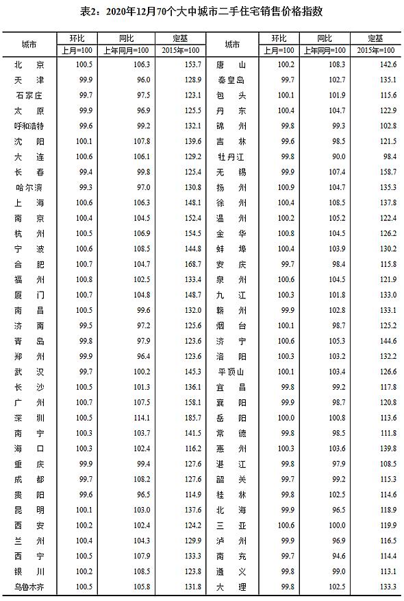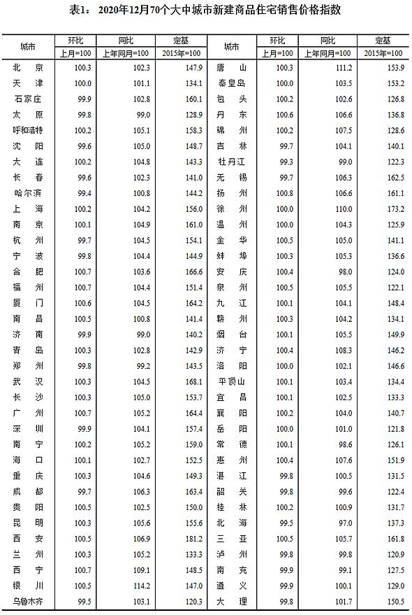 国家统计局今日(1月15日)公布的《70个大中城市商品住宅销售价格变动情况》显示,2020年12月份70个大中城市新建商品住宅价格环比上涨的城市有42个,环比下跌的城市有22个,6个城市环比持平。