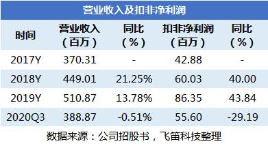 据公司招股书,2019年,公司实现营业收入5.11亿元,同比增长13.78%,扣非净利润为8635万元,同比增长43.84%,业绩增速较快。截至2020年三季度,公司实现收入3.89亿元,同比下降0.51%,扣非净利润为5560万元,同比下降29.19%。