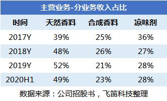 报告期内,天然香料收入占比不断提升,合成香料和凉味剂收入占比整体下降。主要是天然香料受限于自然条件限制、数量有限,通常价格相对较高,能够为公司创造较高的利润,为公司的核心产品,截至2020年上半年,收入占比为49%。