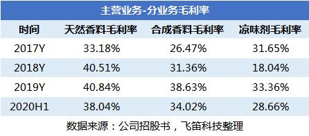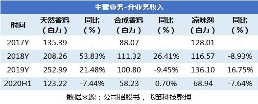 先来看公司的天然香料的收入情况。2019年,天然香料的收入为2.53亿元,同比增长21.48%,尽管增速有所下降,但整体增速较高。公司表示由客户对天然香料的需求旺盛所致。到了2020年上半年,由于公司销售天然香料的结构发生变化,销售价格较高的产品销量下降,因此收入同比下降。