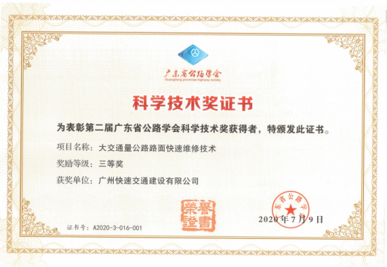 近日,广州交投属下企业广州快速交通建设有限公司通过路况调查、室内试验和实体工程研究,在多年科研实践的基础上,创新研发适用于大交通量公路路面的快速检测和维修技术,并取得了良好的实际运用成效,荣获2020年度广东省公路学会科学技术奖三等奖。