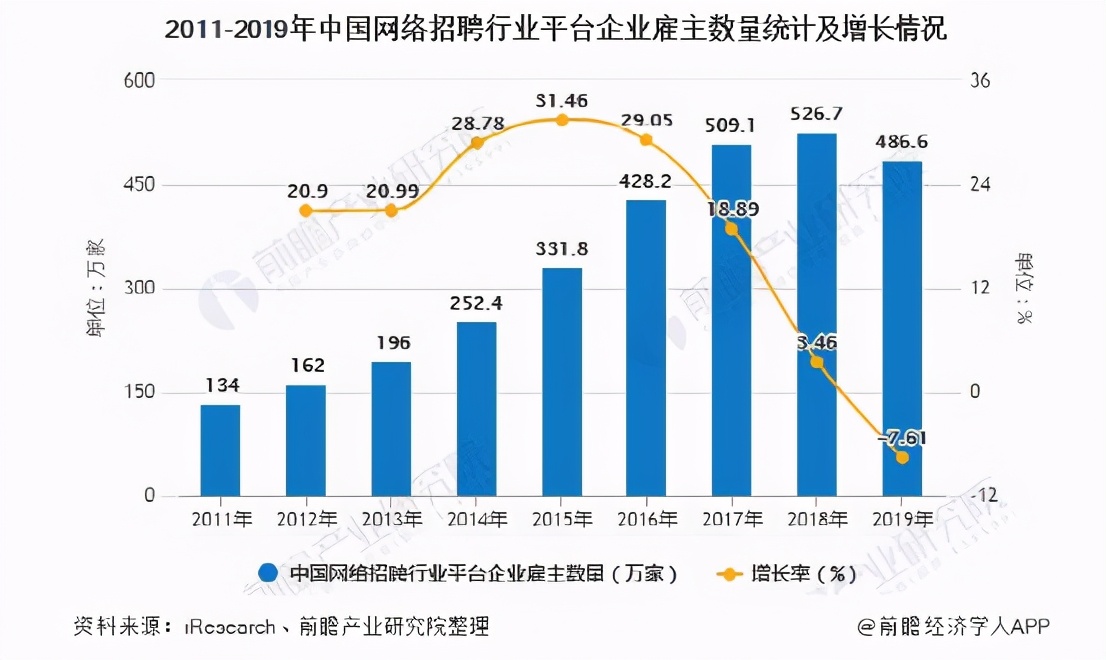 据前瞻产业研究院数据显示,2011年-2018年,在线招聘行业平台企业雇主数量确实一直处于增长阶段,承接了C端人才供给的数量。不过增长速度渐渐趋于缓慢,到2019年招聘平台企业雇主数量开始下降。2019年网络招聘行业平台企业雇主数量为486.6万家,与2018年同比下降7.61%。