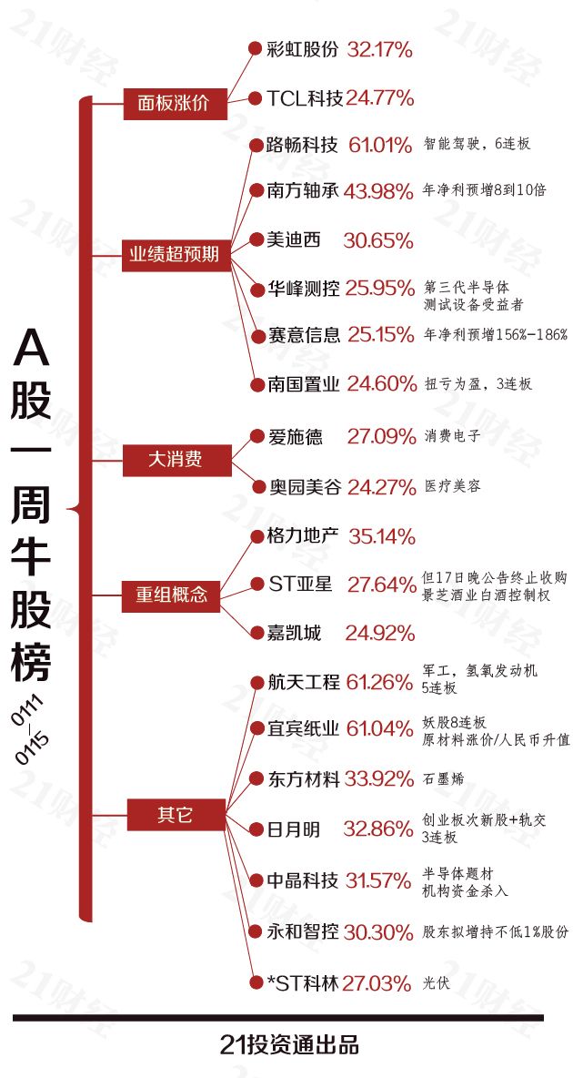 纵观20大牛股,面板涨价、业绩超预期、大消费、重组概念成为本期亮点。