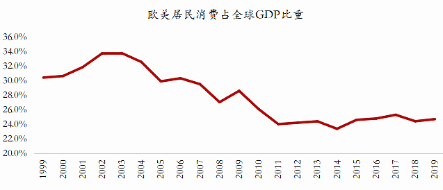 图表 2:欧美居民消费占全球GDP比重过去20年不断下降