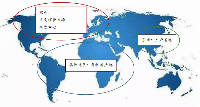 二战以后,伴随着经济全球化,全球逐渐形成了以欧美为主要消费市场和研发中心,东亚为生产制造基地,其他地区为主要原材料提供地的国际“大三角”分工模式。