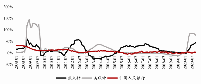 图表 6:美国、欧元区和中国央行资产负债表同比扩张速度