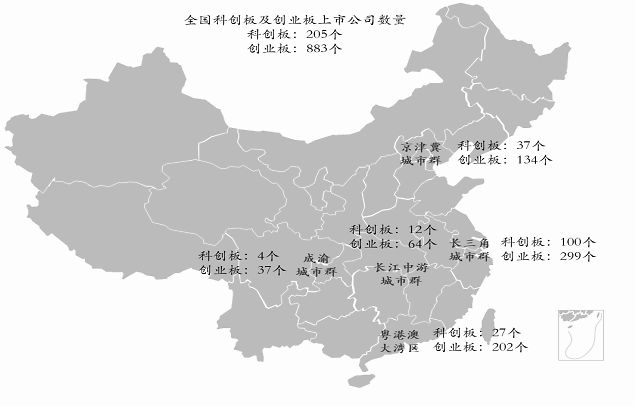 我们认为,中国也在形成中国自身的城市群,由于中国面积巨大,人口众多,因此可能会形成多个城市群。创新力未来将成为中国经济发展的核心驱动力,科创资源集中度高的地区未来的潜力会更大。科创板以及创业板上市公司数量是一个比较直观的反映地区创新能力以及产业转化能力的指标,可以看到长三角、京津冀、成渝、粤港澳、长江中游等城市群集中了中国大多数的科创资源。强科创能力的城市群将会是城镇化下半场的主力军。