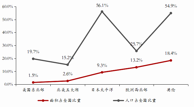 图表 13:全球五大城市群面积和人口占国家(地区)比重