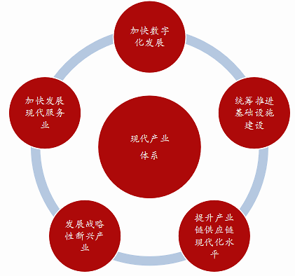 2020年,在《中共中央关于制定国民经济和社会发展第十四个五年规划和二〇三五年远景目标的建议》中,中央提出要坚定不移建设制造强国、质量强国、网络强国、数字中国,推进产业基础高级化、产业链现代化,提高经济质量效益和核心竞争力,具体包括提升产业链供应链现代化水平,发展战略性新兴产业,加快发展现代服务业,统筹推进基础设施建设和加快数字化发展等多个方向。
