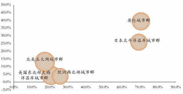 从发达国家发展经验看,城镇化进入成熟期后,资金、人口、技术等要素会向城市群集中。主要发达国家都形成了规模较大的城市群,人口较多、面积较大的国家比如美国形成了不止一个城市群。全球比较知名的城市群包括以纽约为核心的美国东北部大西洋沿岸城市群、以芝加哥为核心的五大湖城市群、以东京为核心的日本太平洋沿岸城市群、以伦敦为核心的英伦城市群和以巴黎为核心的欧洲西北部城市群。这些城市群往往集中了一国或者一个地区较大比例的人口,