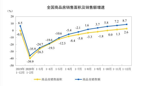 这一销售业绩是在疫情影响的背景下实现的。受疫情影响,去年1-2月,全国商品房销售规模一度下滑近4成。但从二季度开始,市场实现快速反弹。到10月,全国商品房累计销售规模已经超过2019年同期的水平,经过年末的市场“翘尾”后,交易量再度创历史新高。