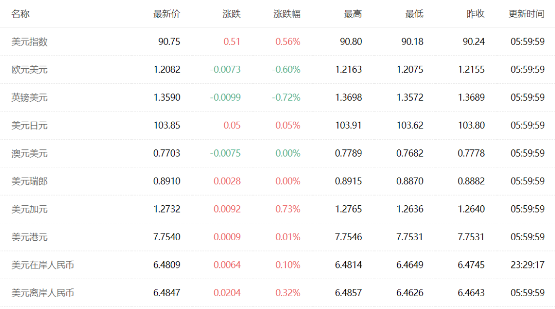 截止1月17日17:00,美元指数上涨0.56%,报90.75;欧元下跌0.60%,报1.2082;英镑下跌0.72%,报1.3590。