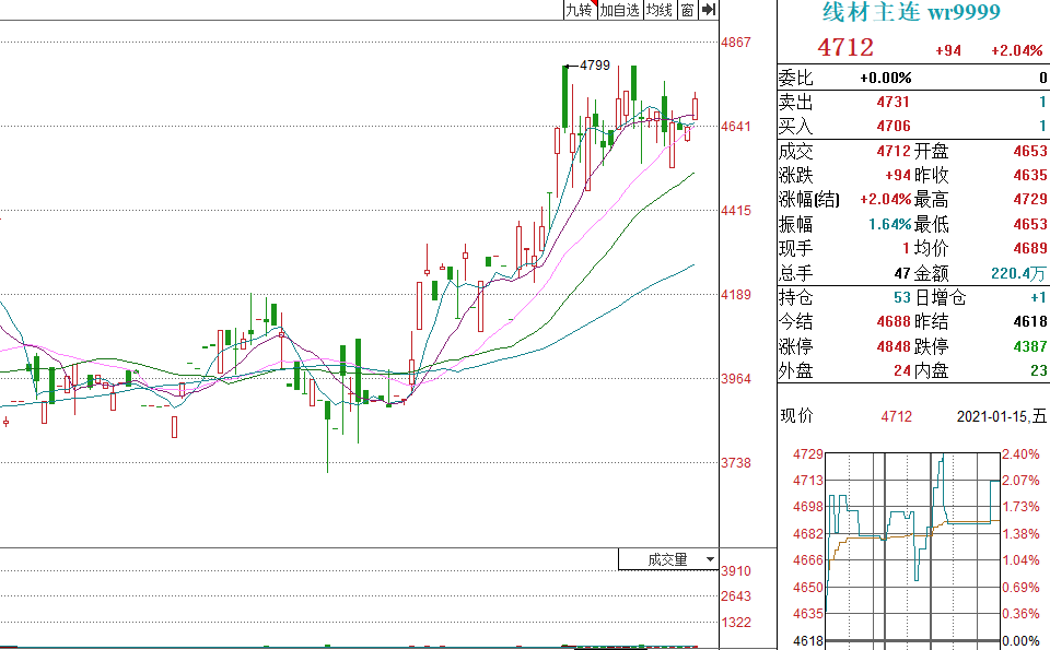 1月17日,截至15:00,线材主连上涨2.04%,交易量220.4万,最新价格4712。