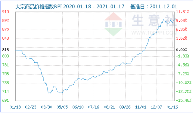 1月17日大宗商品价格指数BPI为895点,较昨日持平,较周期内最高点1019点(2012-04-10)下降了12.17%,较2016年02月03日最低点660点上涨了35.61%。(注:周期指2011-12-01至今)