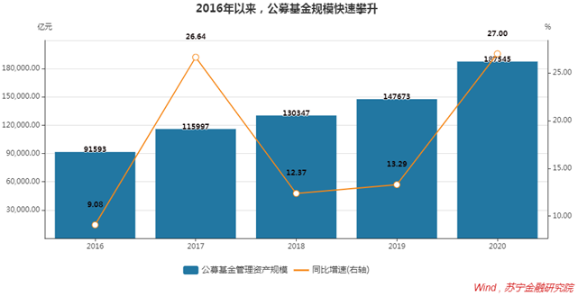 自2016年以来,公募基金规模快速攀升,截止2020年11月,公募基金管理规模达到18.75万亿元,同比增长27%,较2016年翻倍增长。