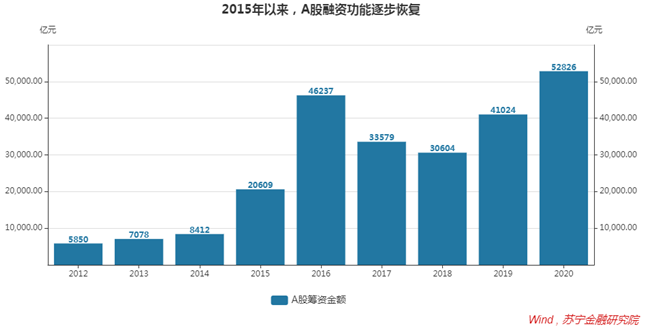 2016-2020年,A股市场年均融资金额4万亿元,是2011-2015年均值的4.2倍,资源配置能力大幅提升。股票供给不断提速的同时,大盘指数还保持了稳步上涨,赚钱效应日趋凸显,对内外资金的吸引力越来越强。