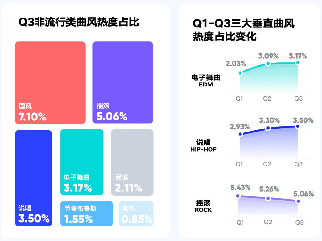 反观国内,据腾讯音乐娱乐集团旗下数据平台「UNI音乐大数据」,尽管「说唱」在华语乐坛整体热度占比中的涨幅并不突出,但自2020年Q1以来一直呈增长趋势,在垂直曲风中,仅次于「国风」和「摇滚」。并且,鉴于「摇滚」自Q1以来一直呈下降趋势,「说唱」或许有可能在不久的未来成为除「国风」外,国内热度最高的垂直音乐风格。