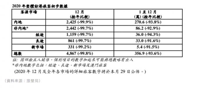 一直以来,每年数千万的内地游客对香港经济贡献良多。然而,由于香港疫情迟迟未能实现“清零”而恢复通关,香港经济复苏前景迷茫。受疫情影响,自2020年2月起,访港旅客人次连续10个月同比跌幅超过90%。香港旅发局1月15日公布的数据显示,2020年全年的初步访港旅客数字为约357万人次,较2019年锐减93.6%。其中,去年内地访港游客同比大减93.8%至270.6万人次。