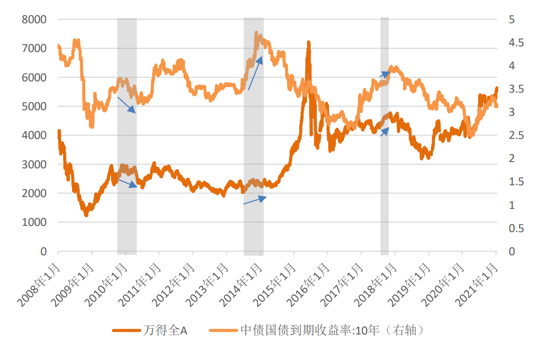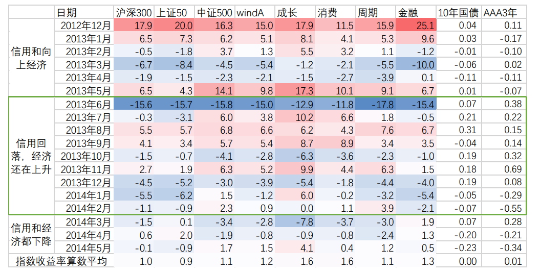 2013年6月的“钱荒”标志着那一轮信用扩张见顶,引发了市场剧烈反应,Wind全A当月回撤近15%。市场在7-9月有所反弹,从13年10月到14年2月增长因子见顶之前,大盘震荡偏弱。在这个“信用回落、经济上行”的时间段内(13年6月-14年2月),股市(Wind全A)大幅震荡最终下跌1%,而债市表现较弱,直到2014年初利率才开始趋势回落。