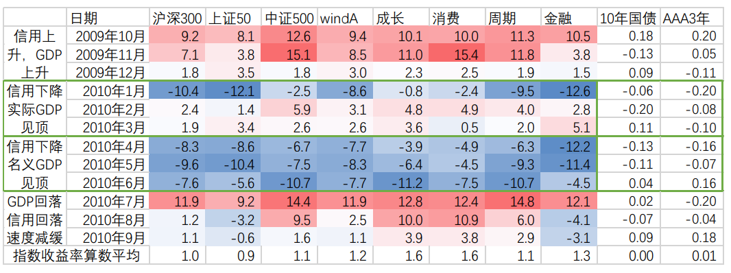 10年Q1:实际GDP见顶,1月市场出现较大回撤,超跌之后2月-3月有所反弹,Q1整体震荡偏弱。10年Q2:名义GDP还在上行,但是股票市场已经开始全面回调,Wind全A连续三个月的回调幅度都超过了7.5%,累计下跌在23%左右。10年Q3:信用和经济同时下行,股票市场超跌反弹。利率在信用见顶之后开始进入下行通道,Q1与Q2的表现差别不大。