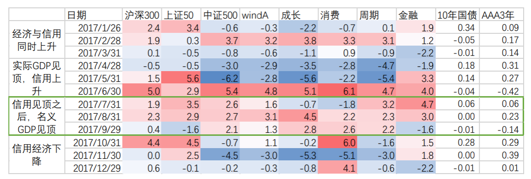 实际情况是如果把“信用回落、经济上行”分为“实际增速见顶”和“名义增速见顶”前后两个阶段(2017年只有名义见顶的阶段),股票在“实际增速见顶之前”往往表现为上涨或震荡,在“实际增速见顶之后”到“名义增速见顶之前”多表现为震荡偏弱或下行。而利率在这个阶段受诸多因素干扰表现分化,抢跑的外部风险主要是政策再度收紧或通胀超预期。