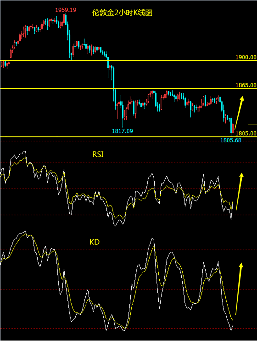 技术分析而言,伦敦金2小时K线周期呈现低位震荡整理走势。短期的支撑位位于1805一线(日内低点附近),短期的压力位位于1865一线(前期高点附近)。RSI指标及KD指标均位于低位,且出现上行的趋势,预示后市大概率走势为上行走势。
