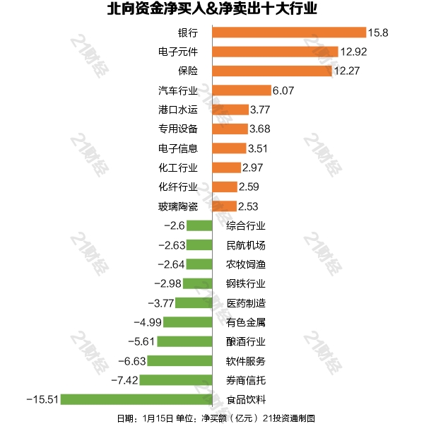 从净买入金额来看,北向资金增持了31个行业,其中银行居首,净买入金额达56.41亿元,其次是电子元件行业,净买入41.23亿元。