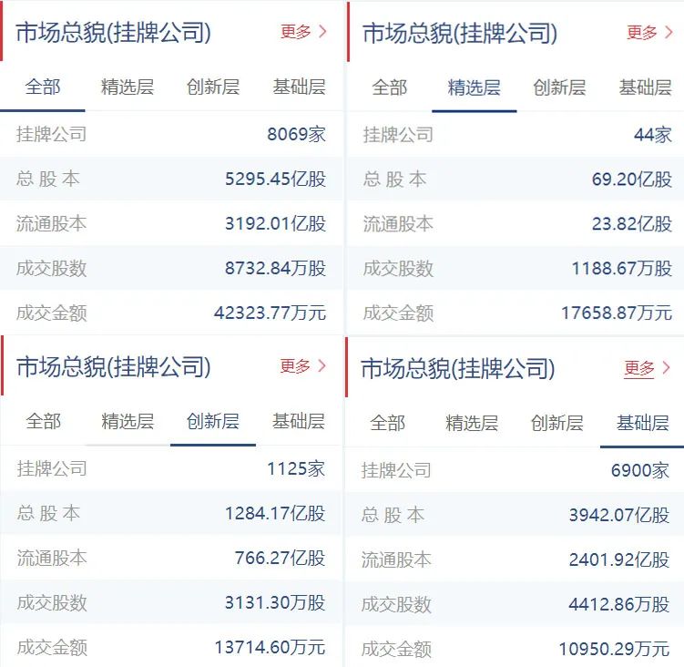 新三板挂牌公司总计8069家(精选层44家,创新层1125家,基础层6900家),总股本5295.45亿股,流通股本3192.01亿股。