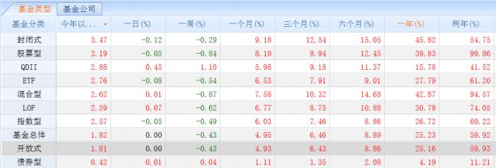 根据同花顺IfinD数据显示,今年以来,虽然市场波动加大,但是公募产品依然表现不俗,偏股型基金的涨幅已经达到3.19%,混合型基金的涨幅也达到了2.62%,今年以来,截至上周五,已经有36只基金的涨幅超过10%,今天这一战果或将继续扩大。