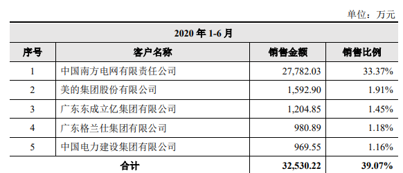 2020年上半年,公司三分之一的销售额都来自于南方电网,远远超过了第二大客户的1.91%。