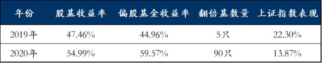 2020年,标准股票型基金的平均收益率为54.99%,混合偏股型基金的平均收益率更是高达59.57%,业绩翻倍的基金多达90只,这一年上证指数的涨幅为13.87%。