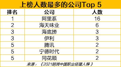 上榜的职业经理人来自24家企业。有7家企业都有不止一位职业经理人上榜。上榜人数最多的是阿里系,其次是海天味业、海底捞和伊利等。