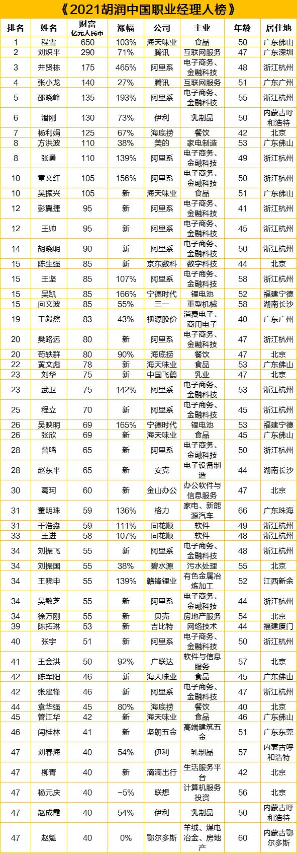 1月19日,胡润研究院发布《2021胡润中国职业经理人榜》,列出了前50名中国最成功的职业经理人。