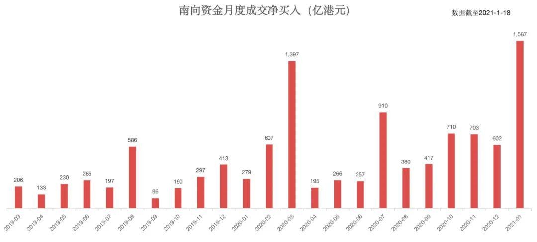 实际上,南向资金净买入港股的举动非常坚定而且持续。数据显示,从2019年3月开始至2020年12月,港股通资金已连续22个月净买入港股。2021年以来,南向资金净买入累计已超1500亿港元。