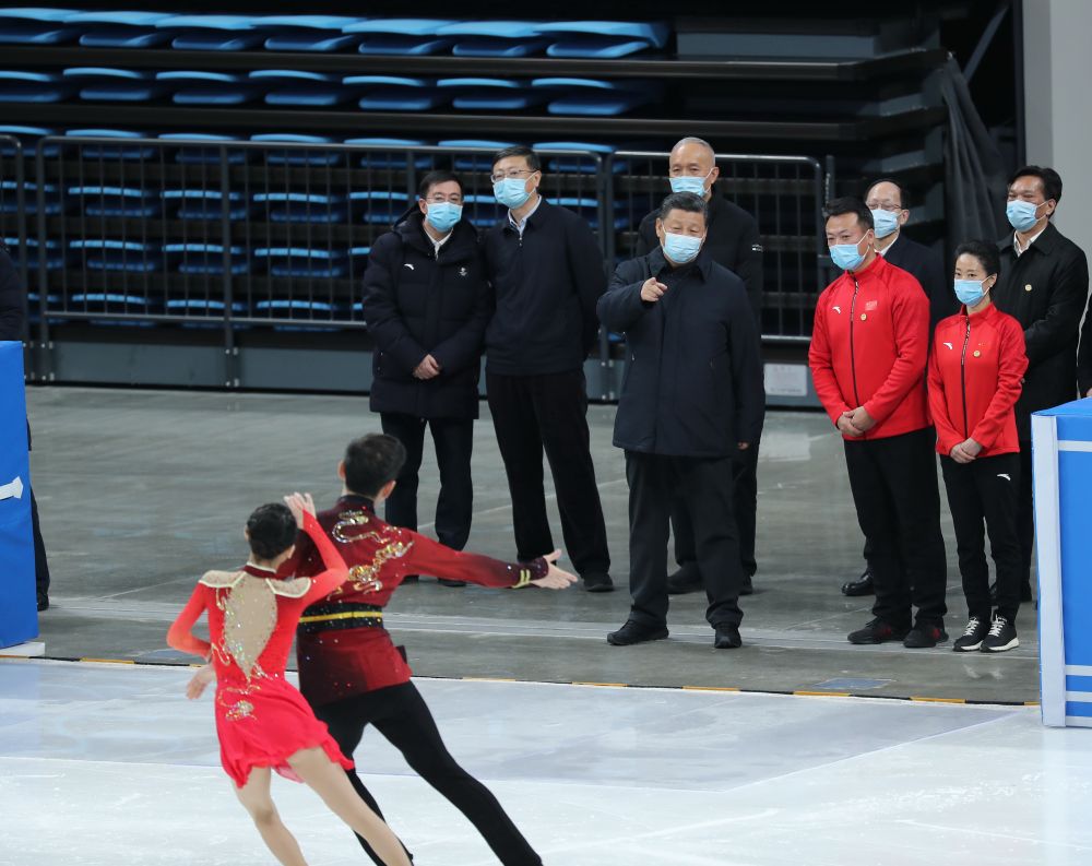 18日,习近平总书记来到位于北京市海淀区的首都体育馆考察调研,并现场观看花样滑冰运动员训练。中国花样滑冰队男单、女单、双人滑、冰舞项目的运动员金博洋、陈虹伊、彭程/金杨和王诗玥/柳鑫宇为总书记做了精彩的训练汇报。在深情、豪迈的《我的祖国》音乐声中,运动员们翩翩起舞,总书记仔细观看,不时询问,并为运动员们的出色表现鼓掌。