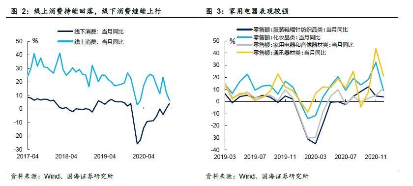 社会消费品零售总额方面,12月数据不及预期。2020年中秋节和国庆节以来,线上消费表现出上行动力不足持续回落,而线下消费小幅上行。12月,“实物商品网上零售额”当月同比增长6.42%,较上月大幅回落5.67个百分点,“社消零售总额”中剔除“网上零售额”的线下消费部分,同比上升4.05%,增速较上个月上行3.65个百分点。疫情以来,消费需求复苏不算强,10月份之后线上消费越发疲软,而年初以来被压制线下消费,如餐饮消费行业等则持续反弹。
