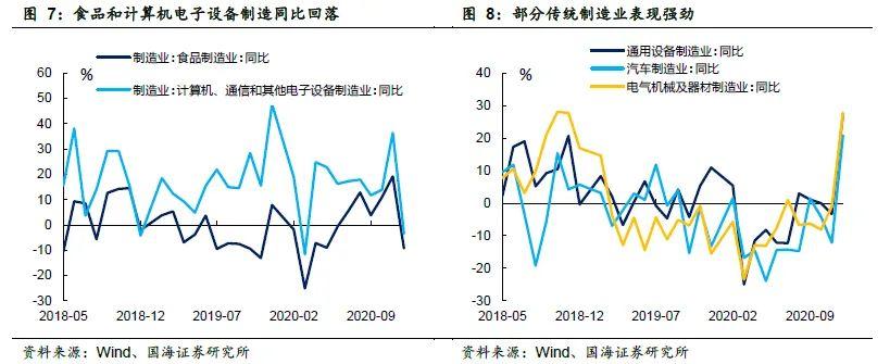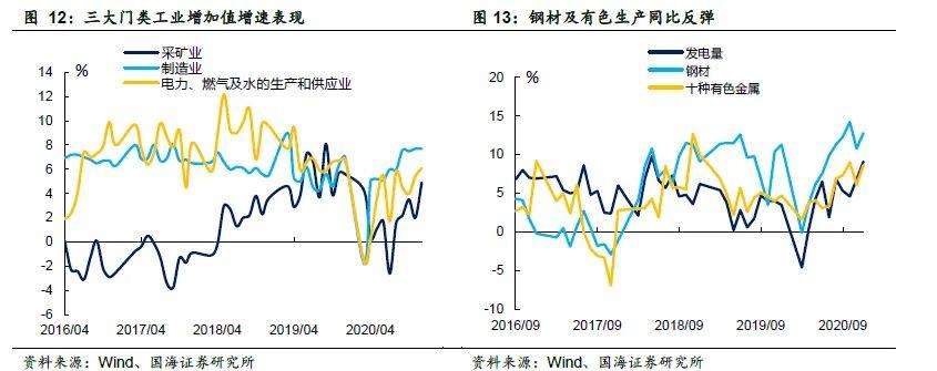 12月份钢材和有色金属生产同比增速都出现明显反弹,受天气因素影响,发电量上行较明显。前两个月表现较好的行业如纺织、金属以及电器机械及器材本月增速均小幅回落,但由于出口表现近期仍然较强,叠加地产行业的持续火热和海外补库周期的即将打开,金属制品和有色金属加工都保持较高增长。