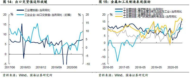 出口方面,和我们之前的判断类似,海外产能缺口依然存在,但由于前期耐用品消费增长幅度过大,未来海外对商品需求将有所回落,从最新的出口交货值数据来看,同比增速已展现出边际放缓,我们预计,即使美国第三轮刺激法案能够落地,也仅仅改变进口需求的回落速率。