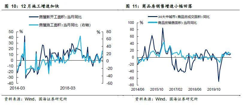 12月份地产投资小幅回落,增速依旧维持在高位。12月施工、新开工面积增速继续增加。尽管“三条红线”政策下房企融资有压力,但是在销售不差的大环境下,房地产企业近期仍将加速赶工,消化2020年二季度购入的土地储备。2021年一季度结束前,地产投资预计仍将保持韧性。